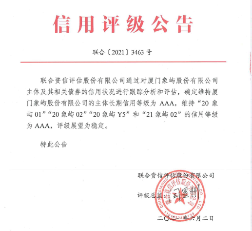 6月2日,權(quán)威評(píng)級(jí)機(jī)構(gòu)聯(lián)合資信評(píng)估股份有限公司(以下簡(jiǎn)稱“聯(lián)合資信”)出具《廈門象嶼股份有限公司公開發(fā)行公司債券2021年跟蹤評(píng)級(jí)報(bào)告》,維持