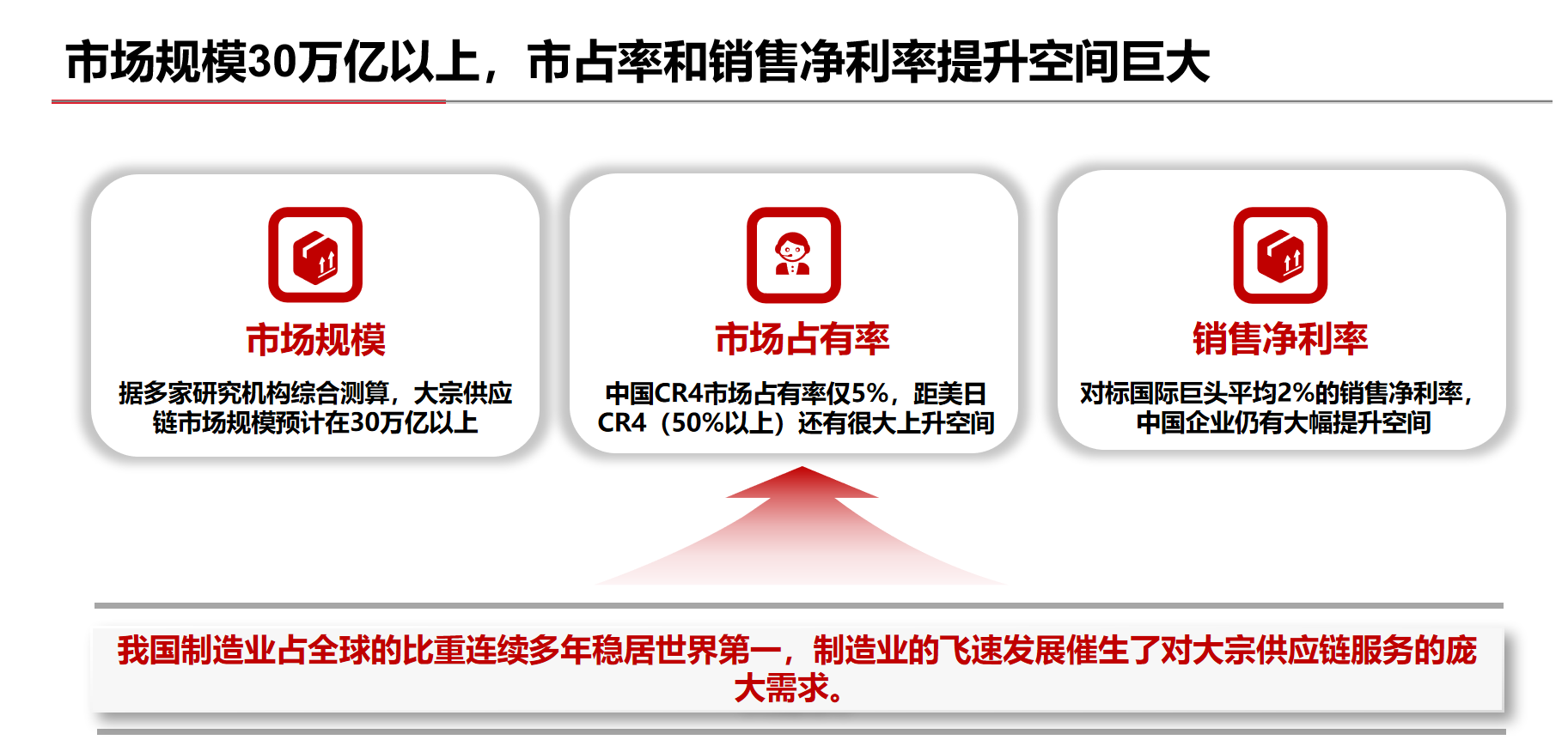制造業(yè)企業(yè)日益專業(yè)化,對供應鏈服務的需求從簡單追求成本,轉變?yōu)楦非笮?,市場亟需?span style="color: rgb(239, 25, 25); box-sizing: border-box;">提供“一攬子”服務、具備效率優(yōu)勢的大宗供應鏈服務商。
