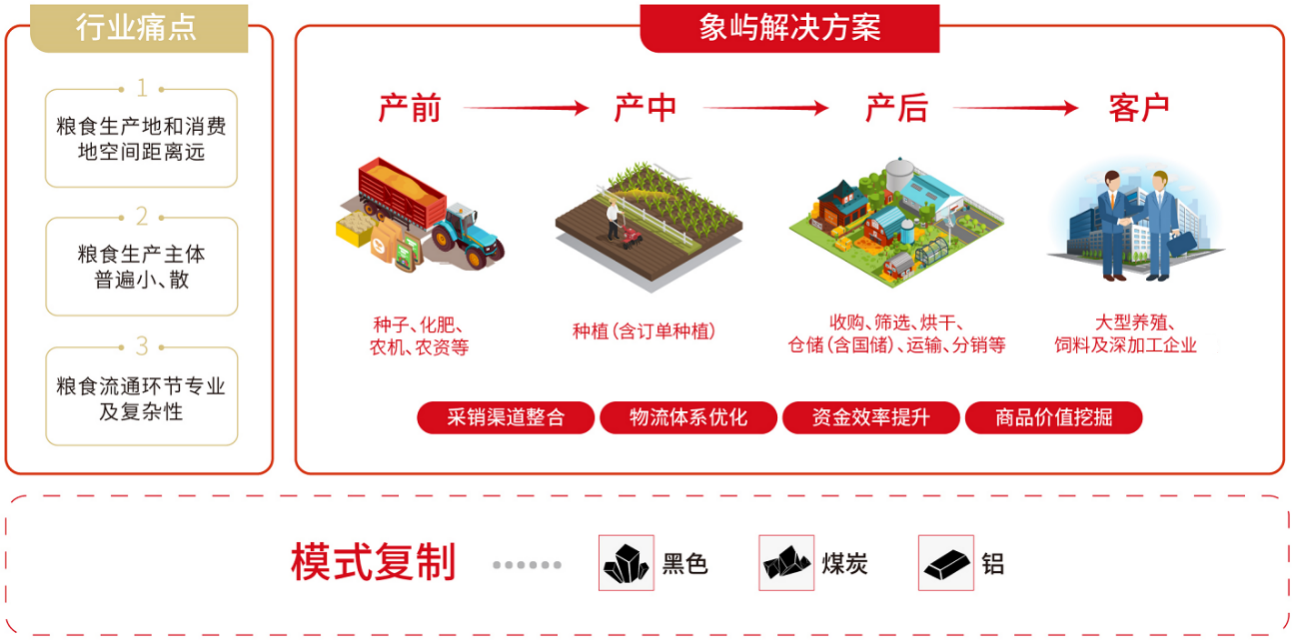 今年初,象嶼聯(lián)手阿里云結(jié)合東北農(nóng)業(yè)實(shí)際,攜手在糧食板塊先行先試建設(shè)農(nóng)業(yè)產(chǎn)業(yè)級(jí)互聯(lián)網(wǎng)平臺(tái)。該平臺(tái)將貫穿糧食產(chǎn)業(yè)鏈種植、倉(cāng)儲(chǔ)、流通三大環(huán)節(jié),借助物聯(lián)網(wǎng)、云計(jì)算、區(qū)塊鏈?zhǔn)侄螌?shí)現(xiàn)輕資產(chǎn)模式下倉(cāng)容快速擴(kuò)張,連接用糧方、金融、物流等生態(tài)方,提升全產(chǎn)業(yè)鏈貿(mào)易、物流與金融效率。 未來,象嶼農(nóng)產(chǎn)將做深“一條鏈”,做大“一個(gè)園”,形成共創(chuàng)共享共贏的全產(chǎn)業(yè)鏈資源生態(tài)系統(tǒng),圍繞“雙循環(huán)”發(fā)展格局,進(jìn)一步優(yōu)化投資結(jié)構(gòu),延伸投資鏈條,創(chuàng)新產(chǎn)業(yè)模式,為鄉(xiāng)村振興、促進(jìn)農(nóng)業(yè)高質(zhì)高效發(fā)展貢獻(xiàn)力量!