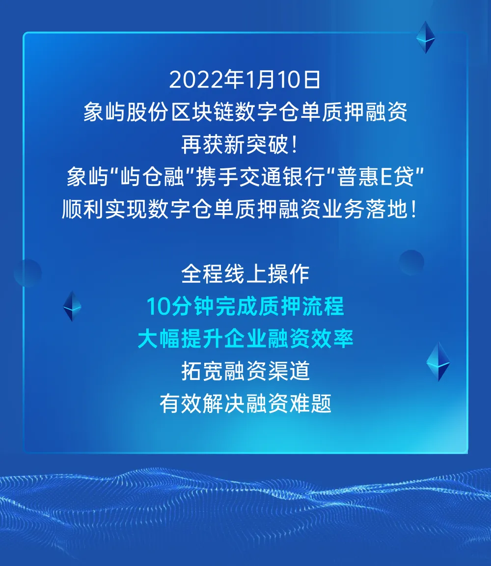 象嶼“嶼倉融”助力交行“普惠E貸”數(shù)字倉單質(zhì)押融資業(yè)務(wù)成功落地!